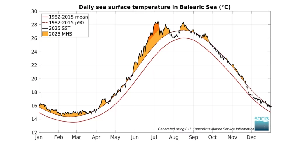En el caso del archipiélago balear, las mediciones han mostrado temperaturas superficiales cercanas a los 31 °C durante episodios concretos del verano, cifras muy poco habituales en esta zona.
