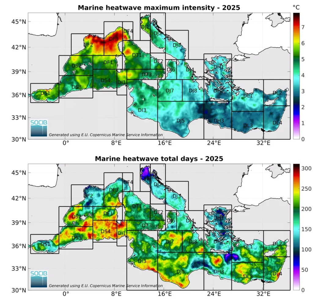 Olas de calor marinas en el Mar Mediterráneo durante 2025