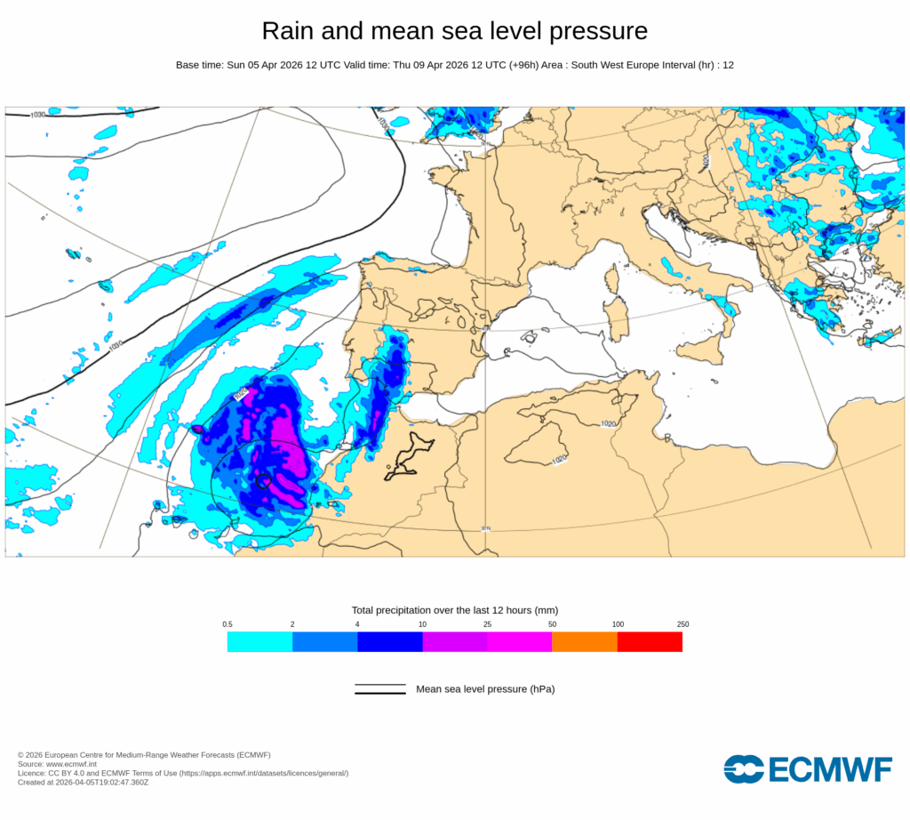 Se espera que las precipitaciones puedan dejar acumulados importantes en el oeste del Sistema Central y también pueden ser puntualmente fuertes y acompañadas de tormenta en el oeste de Galicia, Extremadura y de Castilla y León, sin descartarse que puedan ir acompañadas de rachas muy fuertes y granizo menudo.
