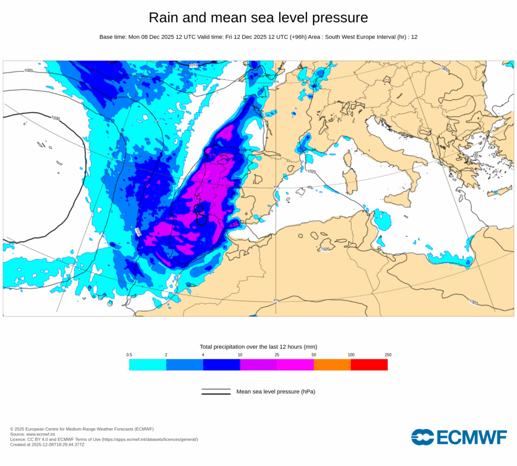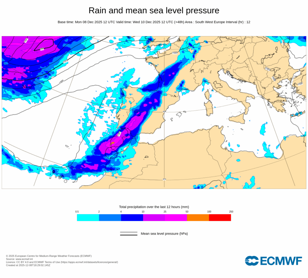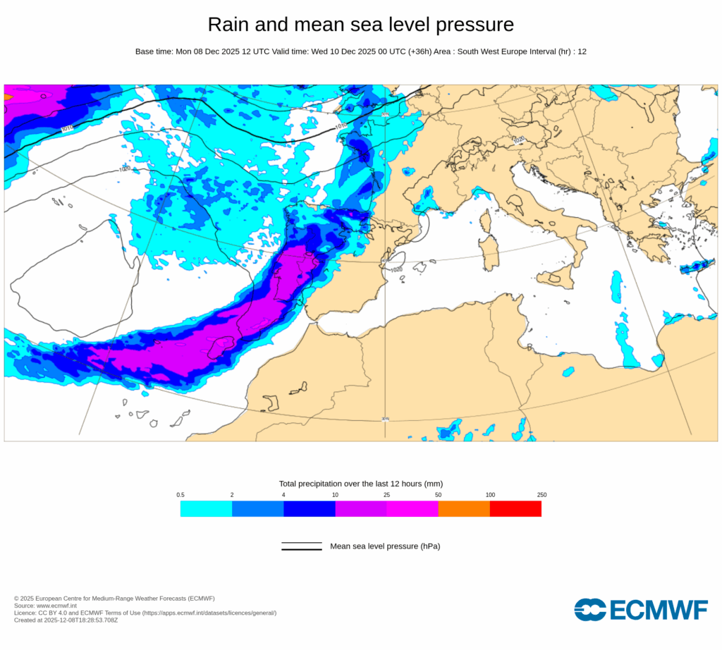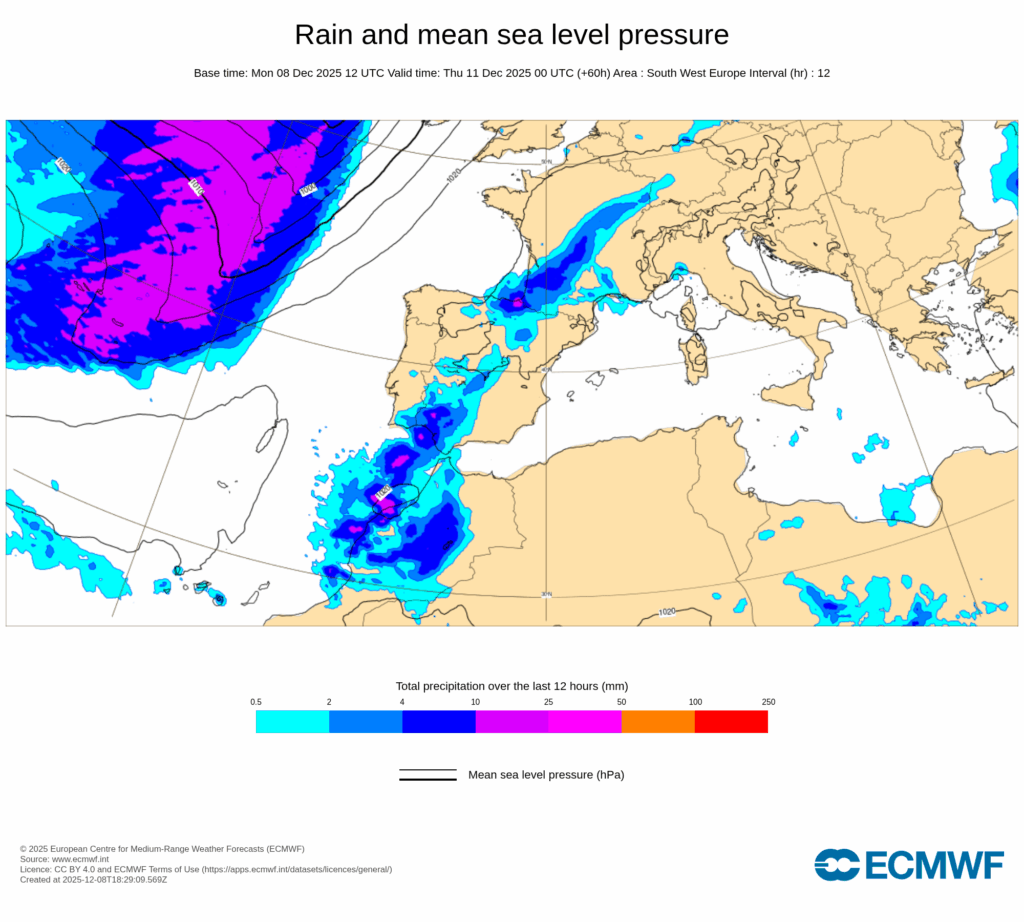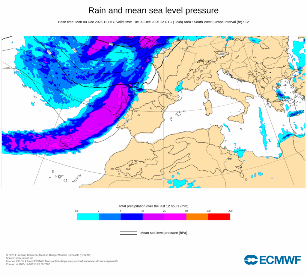 Los mayores acumulados se darán en el oeste de la Península, pudiendo ser fuertes y persistentes en Galicia, oeste del área cantábrica y del sistema Central, Extremadura y Andalucía occidental, sin descartar el oeste de Alborán.