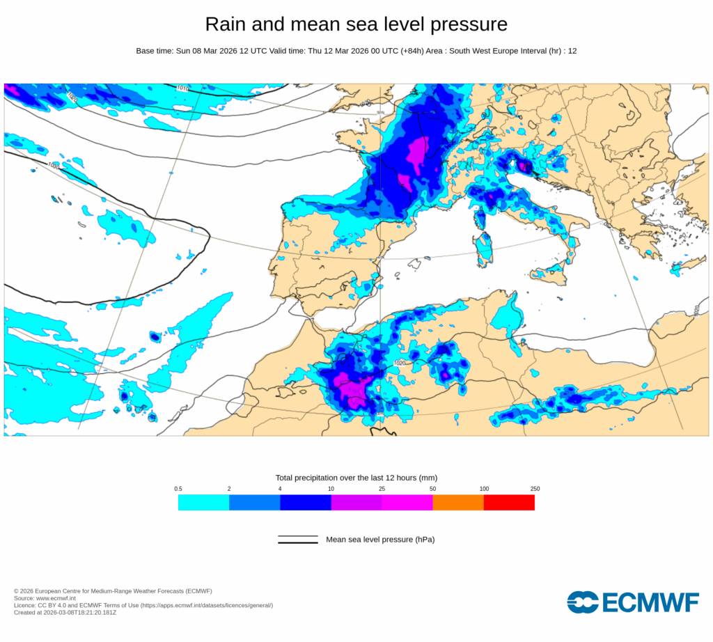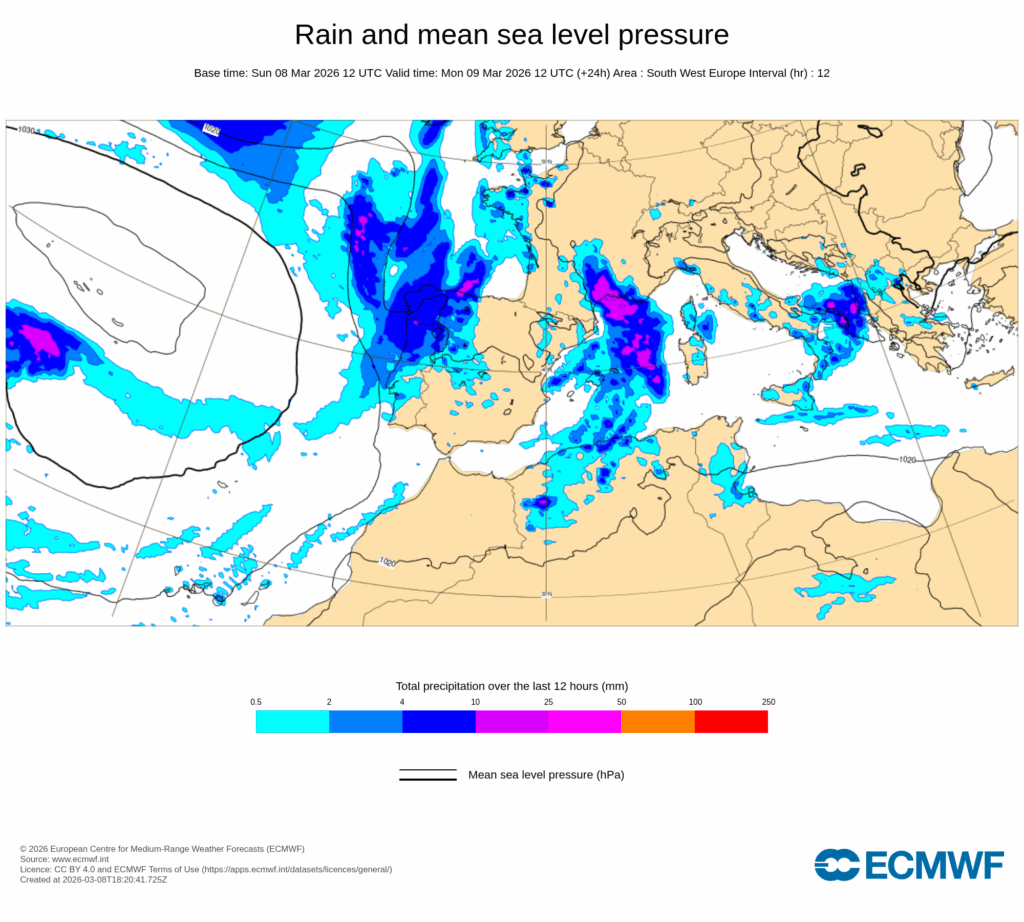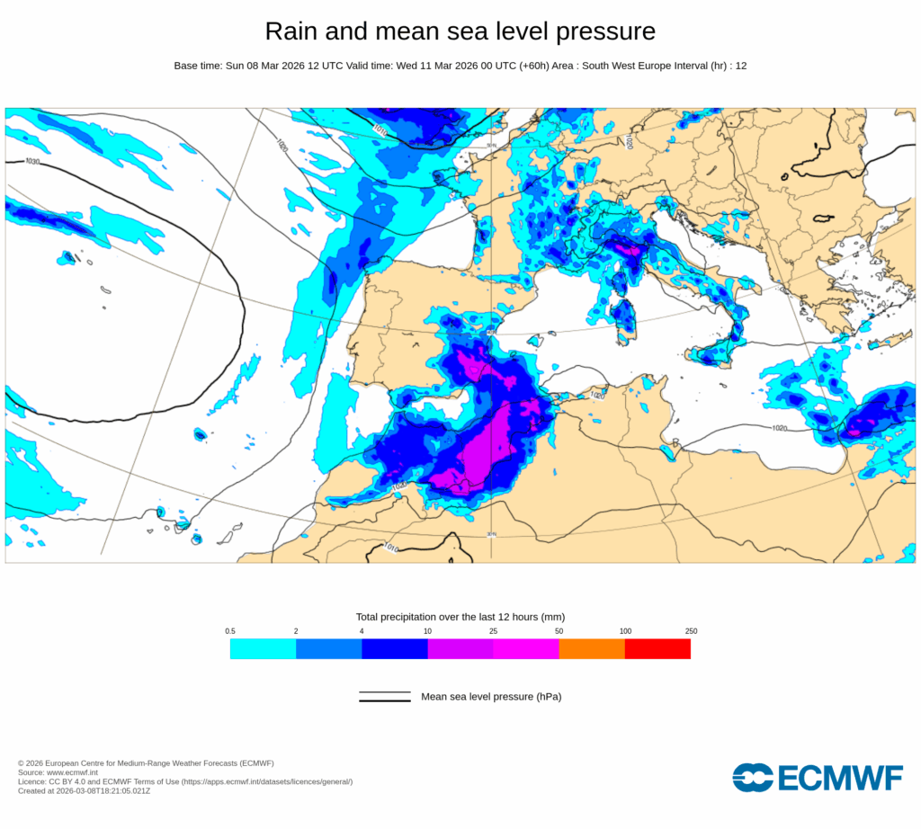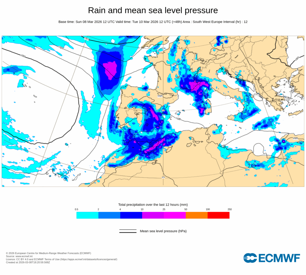 Durante el martes día 10 de marzo, se mantendrá la inestabilidad en la Península y Baleares bajo la influencia de una DANA con bastante incertidumbre sobre su posición al final del día en el sur peninsular.