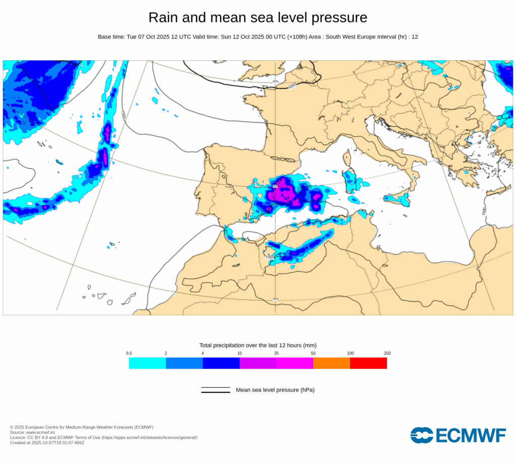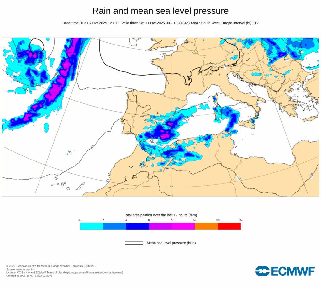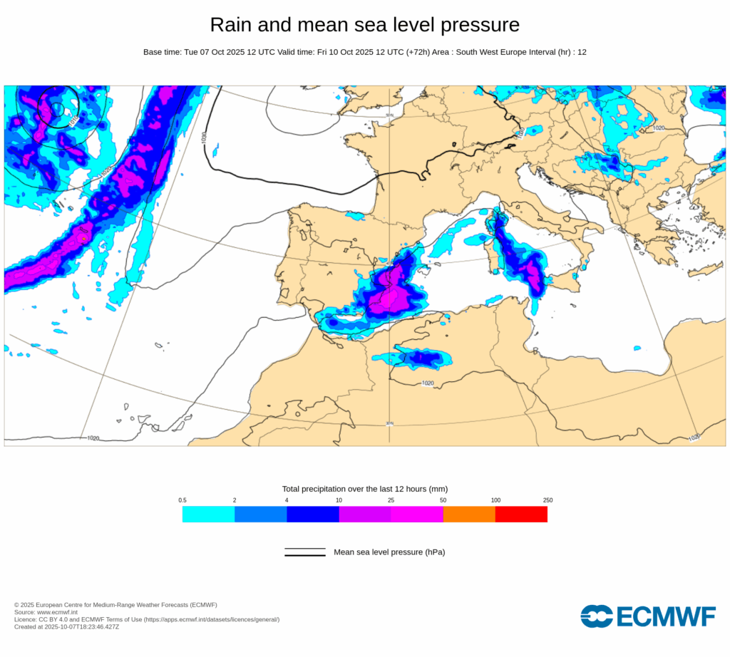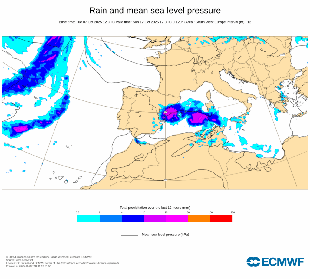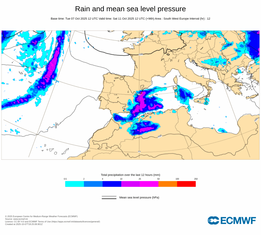 Esta configuración sinóptica será bastante estacionaria, propiciando un bloqueo que hará que persistan las condiciones descritas durante varios días, con precipitaciones muy fuertes y persistentes afectando principalmente al tercio este peninsular y Baleares desde últimas horas de miércoles 8 y, al menos, hasta el domingo 12.