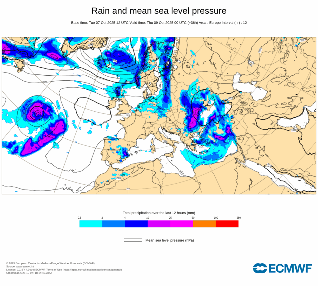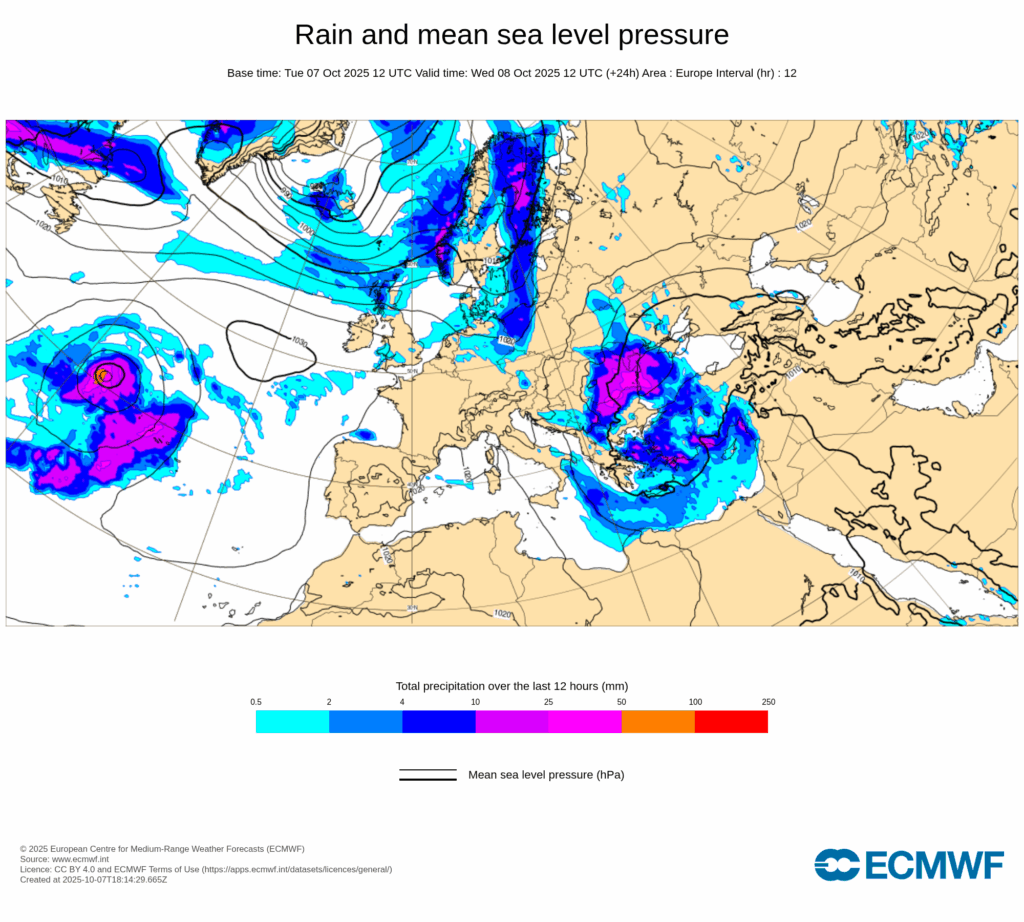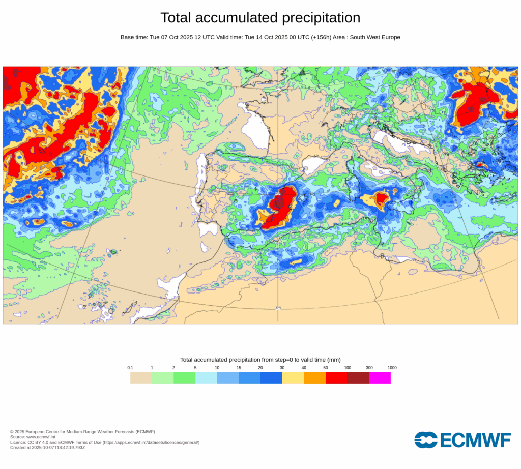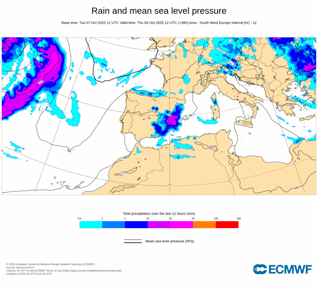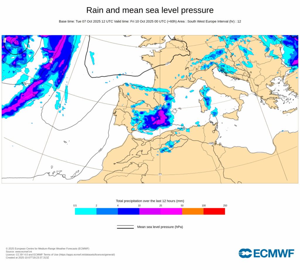 Esta configuración sinóptica será bastante estacionaria, propiciando un bloqueo que hará que persistan las condiciones descritas durante varios días, con precipitaciones muy fuertes y persistentes afectando principalmente al tercio este peninsular y Baleares desde últimas horas de miércoles 8 y, al menos, hasta el domingo 12.