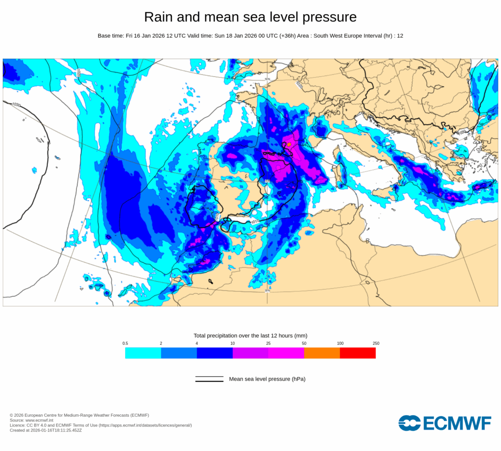 A partir del sábado 17, se espera que las precipitaciones comiencen a afectar a zonas del nordeste peninsular y Baleares, sin descartar que sean localmente fuertes y persistentes, y siendo en forma de nieve en áreas de montaña a partir de 1000-1200 m.