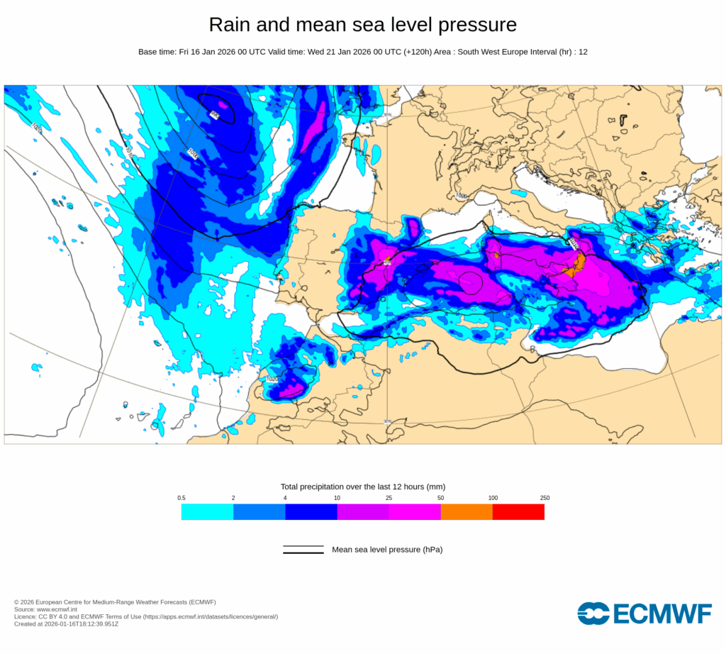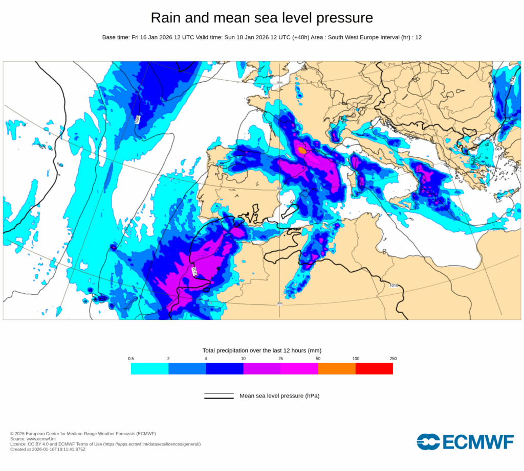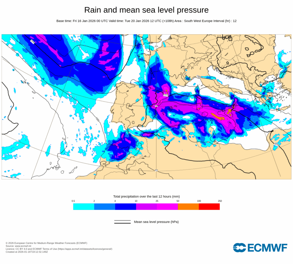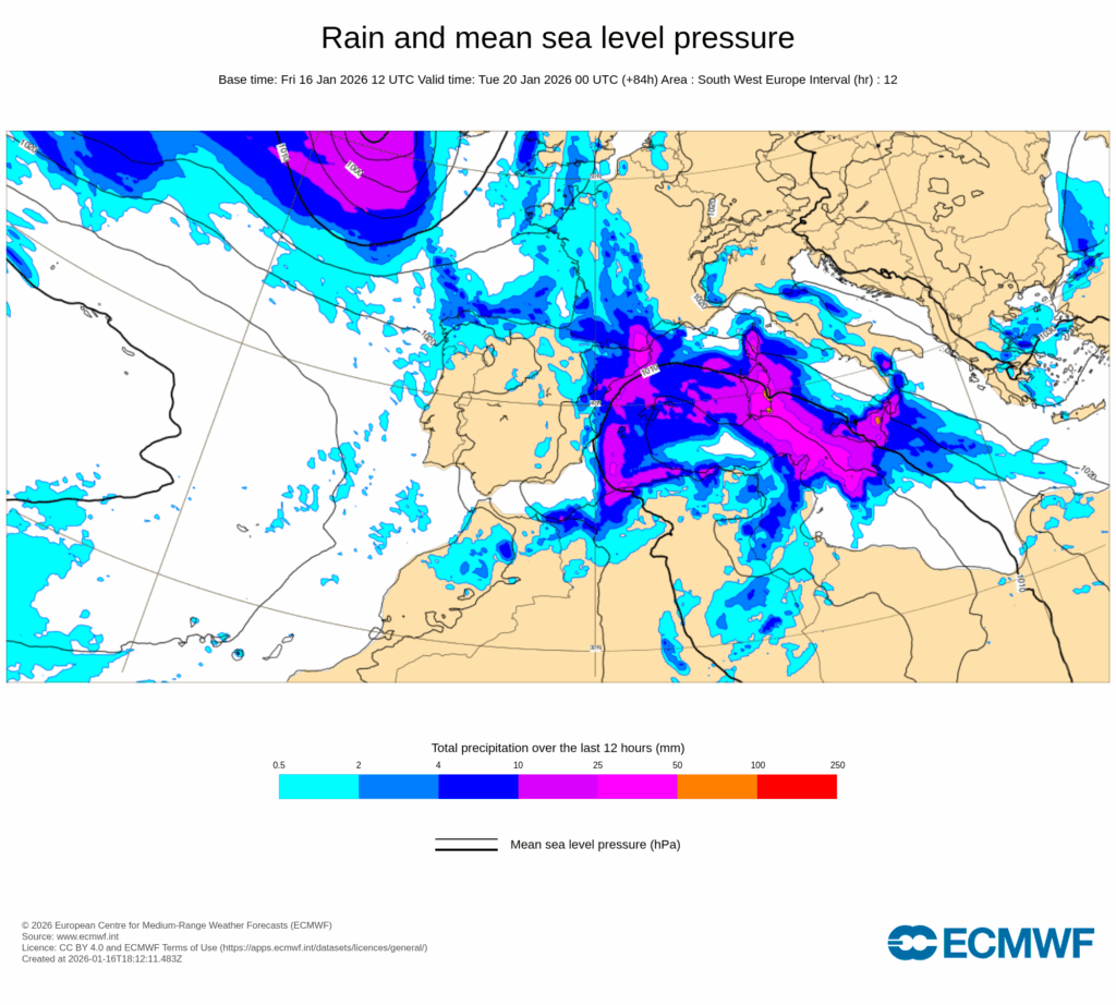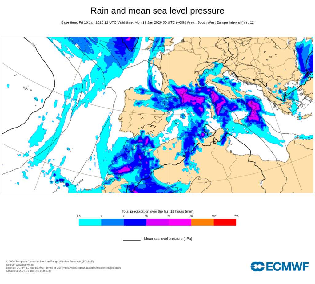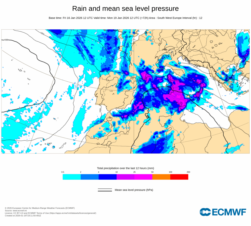 En combinación con el anticiclón europeo, se establecerá un intenso flujo del este muy húmedo sobre la mitad norte del área mediterránea peninsular y Baleares, y que a partir de la tarde del lunes dará lugar a un temporal marítimo con probables rachas muy fuertes, precipitaciones que pueden ser localmente fuertes y muy persistentes, así como nevadas copiosas en zonas de montaña, especialmente en el sur y este de Cataluña, Comunidad Valenciana y sur de Aragón.