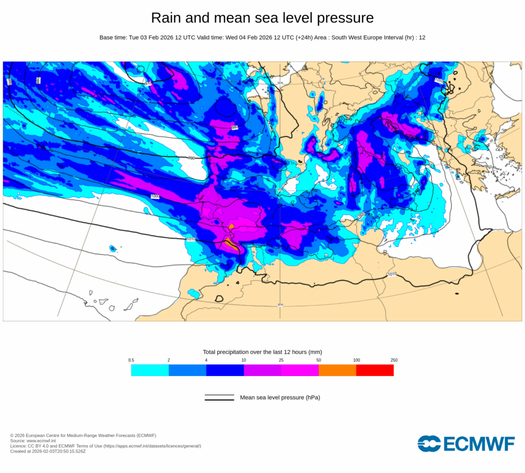Por tanto, este miércoles 4, con la llegada de la masa templada y húmeda junto con los primeros sistemas frontales asociados a Leonardo, se darán lugar a precipitaciones intensas y extraordinariamente persistentes en el tercio sur peninsular.