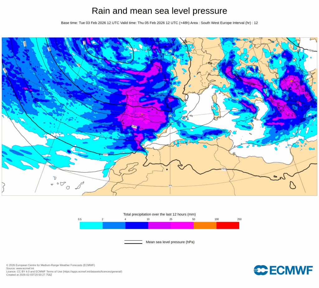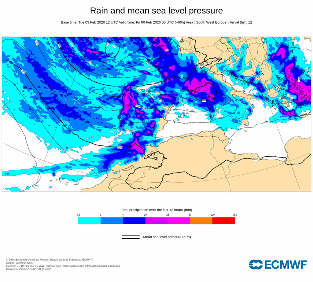 Las precipitaciones generalizadas persistirán durante la primera mitad del jueves 5, cuando la Península continuará bajos los efectos de un flujo húmedo del oeste a suroeste y el paso de nuevos frentes atlánticos asociados a Leonardo, trasladándose las acumulaciones más significativas a gran parte de los entornos montañosos a barlovento del flujo del oeste del centro y norte peninsular.