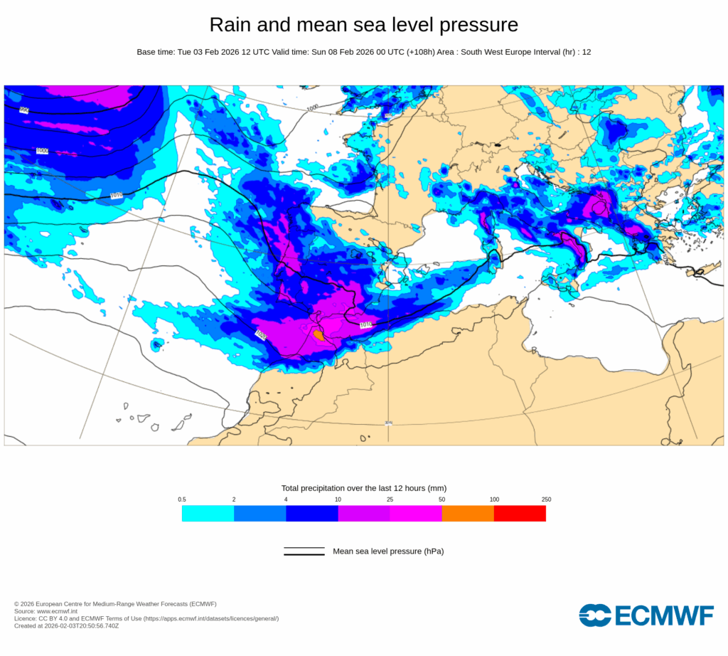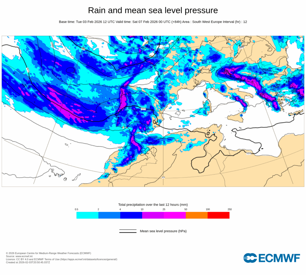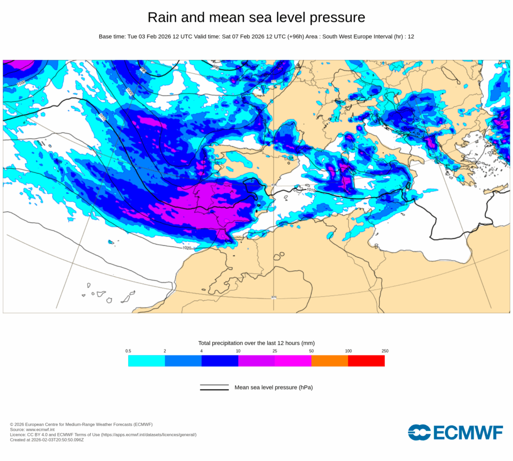 En consecuencia, se esperan precipitaciones localmente fuertes y extraordinariamente persistentes en puntos de Andalucía, con acumulaciones que serán muy significativas en zonas montañosas a barlovento del flujo del oeste y que, dado el alto nivel de saturación del suelo, podrán dar lugar a un significativo impacto hidrológico en cuencas de las vertientes atlántica y mediterránea de Andalucía, así como a probables deslizamientos de tierra.