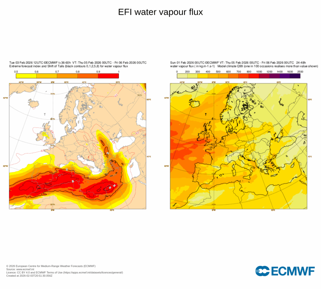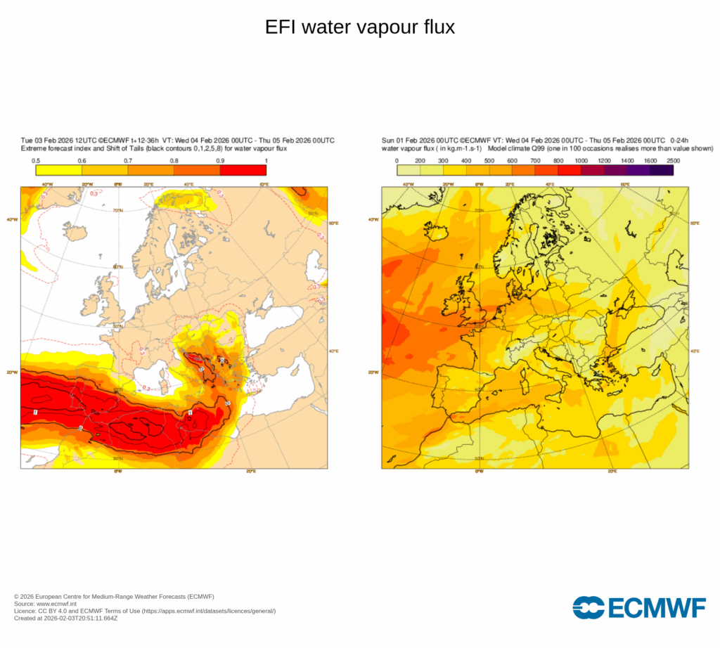 La circulación atlántica inducida por Leonardo arrastrará al tercio sur peninsular una masa de aire de origen tropical que se caracterizará por un contenido en agua precipitable muy alto, especialmente anómalo para la época del año.