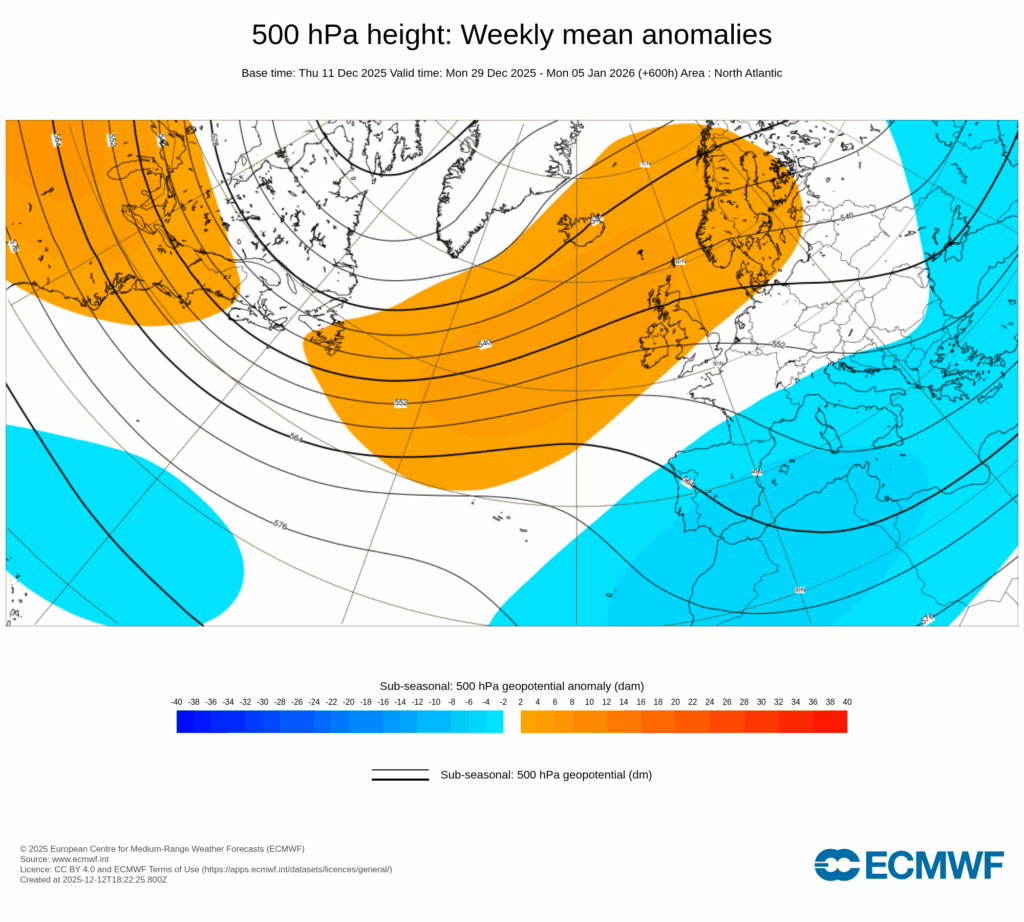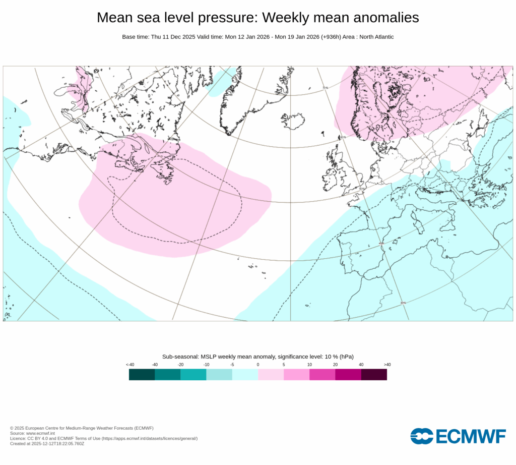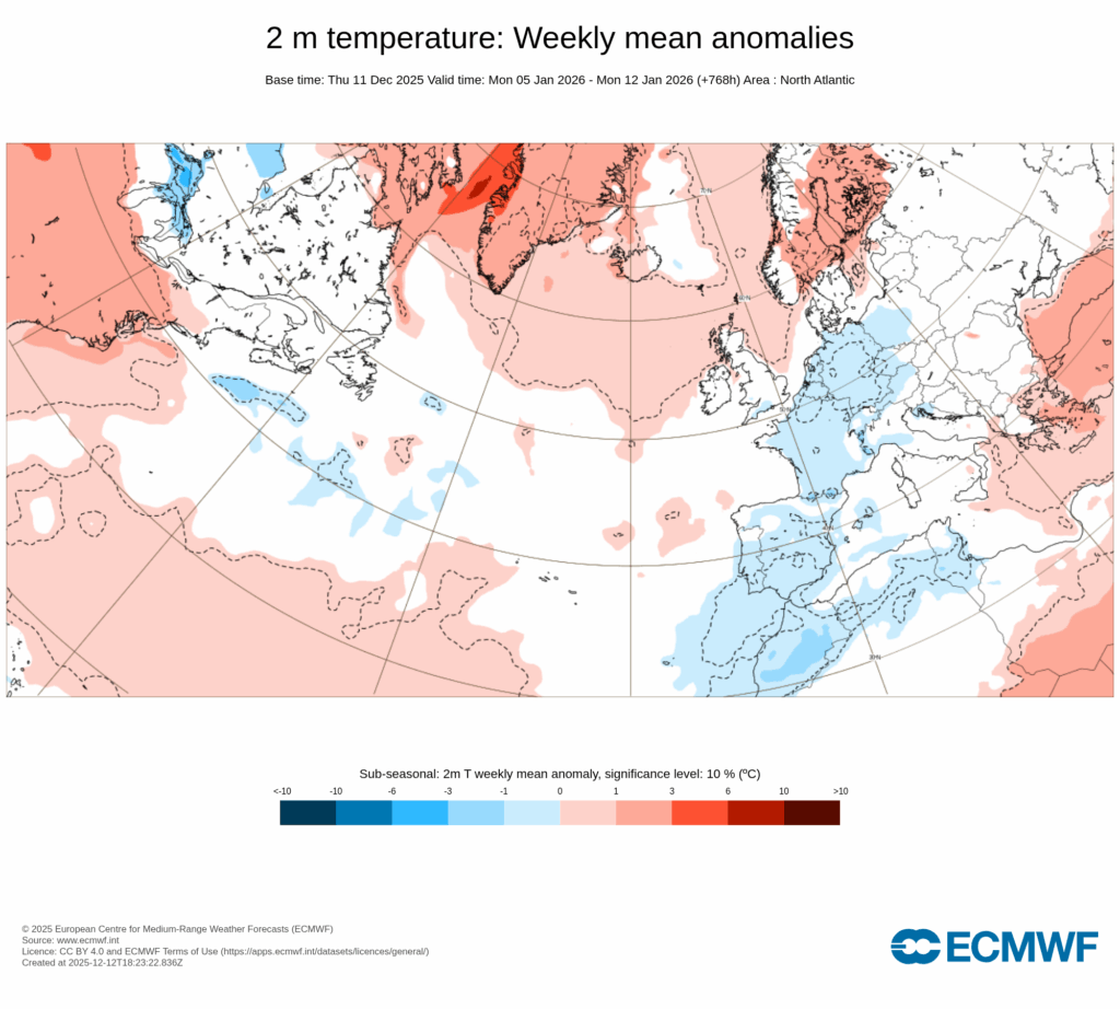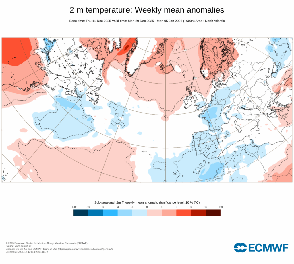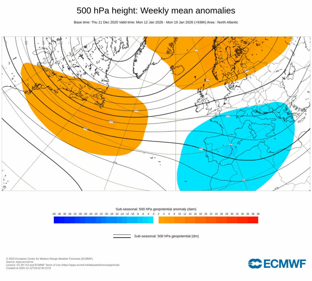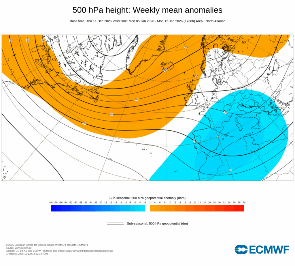 Y avanzando más en el mes y en el arranque de 2026, los mapas a largo plazo dibujan anomalías negativas de temperatura y presión en el sur y suroeste de Europa mientras que persistiría el bloqueo anticiclónico en Escandinavia y en el interior de Europa, con lo que es de esperar la continuidad del tiempo inestable y frío en buena parte de España.
