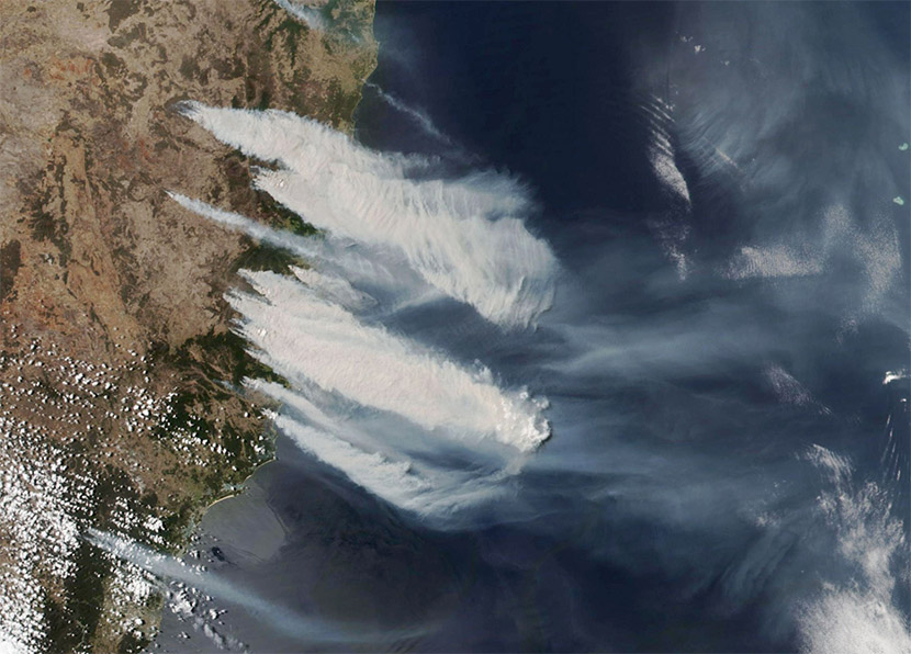 Tres horas después de que se adquiriera esta imagen, el Servicio de Bomberos Rurales de Nueva Gales del Sur informó de 96 incendios en todo el estado, con 57 que permanecieron sin contener. Diecisiete fueron incendios de nivel de emergencia: el nivel de alerta más alto para un incendio forestal. Según informes noticiosos, ese es el mayor número de incendios de emergencia que el estado ha visto arder a la vez.