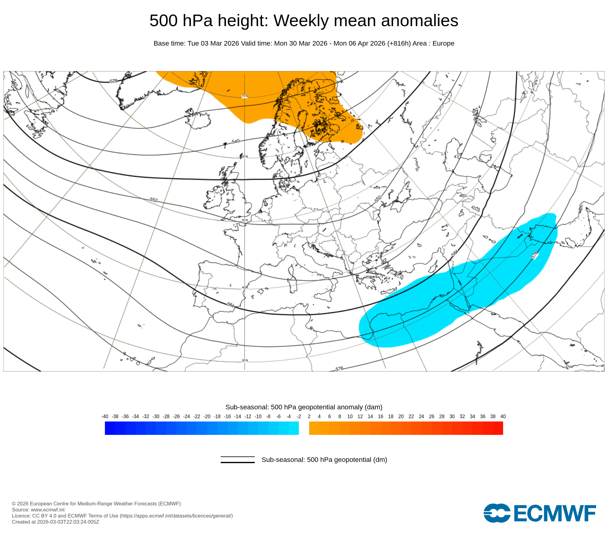 Y si nos vamos a las anomalías de presión a una altitud aproximada de 5.500 metros, las anomalías son nulas en casi todo nuestro entorno, siendo negativas hacia el Mediterráneo Oriental y positivas hacia Escandinavia.