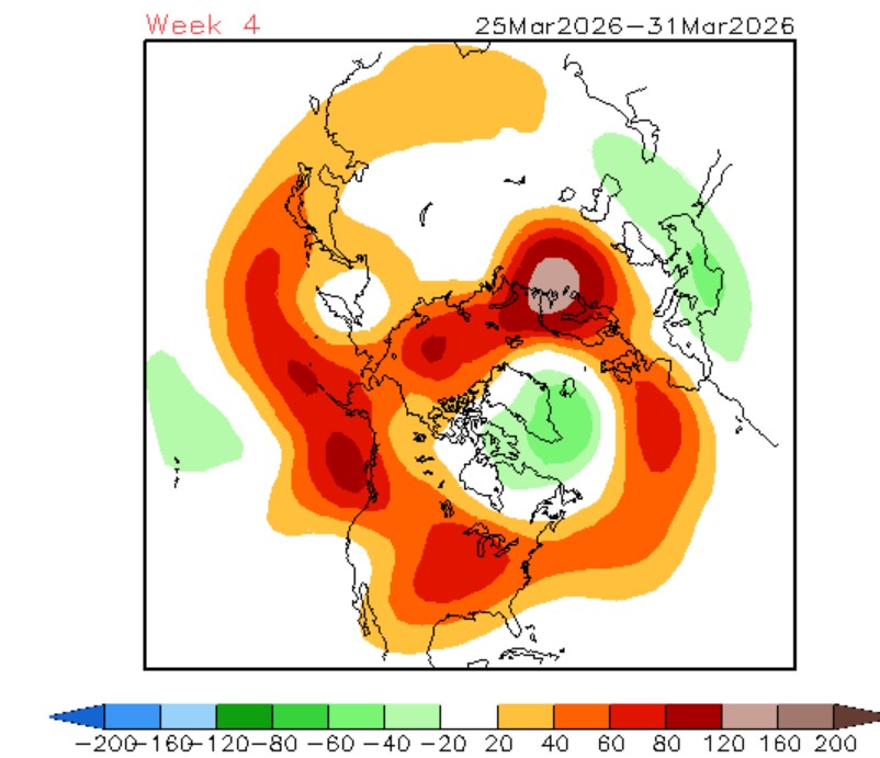 Un panorama muy similar al que nos dibuja el modelo norteamericano CFS v2 para unos días antes al grueso de la Semana Santa 2026, aunque con un mayor refuerzo de las altas presiones en Azores: