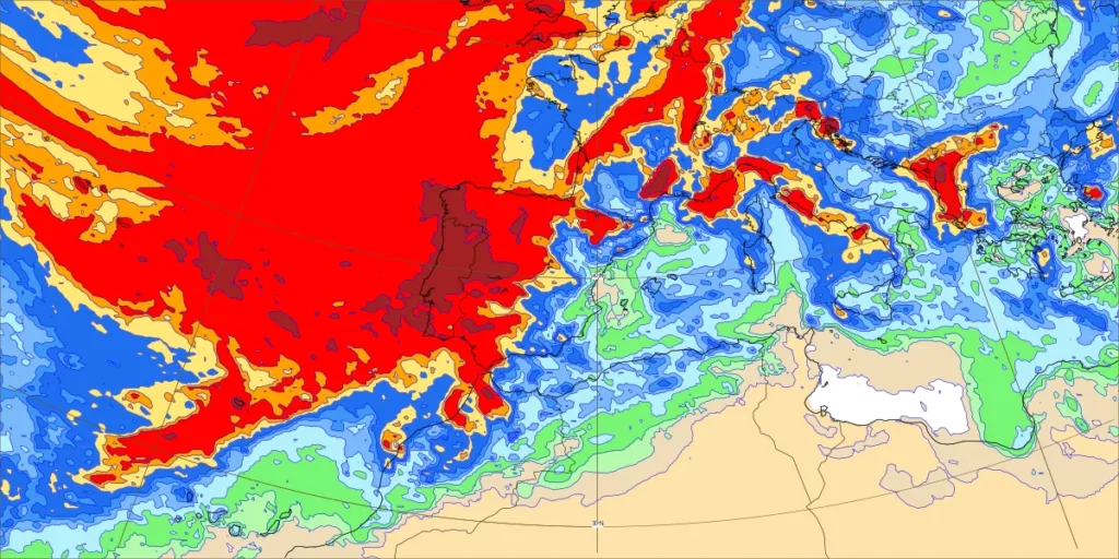La proximidad de una baja en el suroeste peninsular hará, aún con cierta incertidumbre sobre la hora, aumentar la nubosidad en la Península de suroeste a noreste, dejando los cielos muy nubosos o cubiertos en el oeste y suroeste y muy abundante nubosidad alta en el resto.