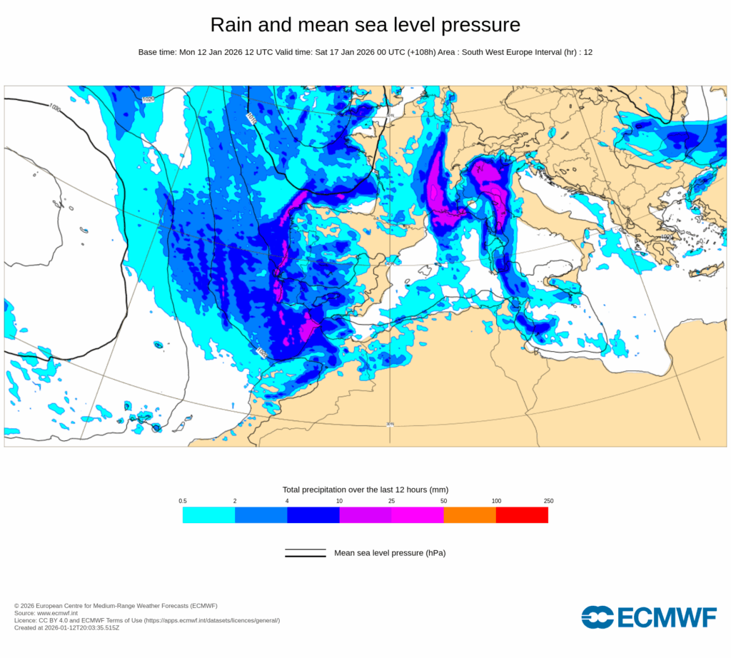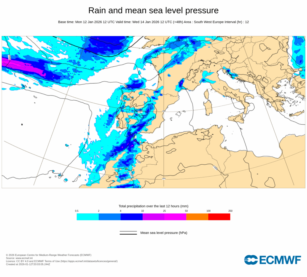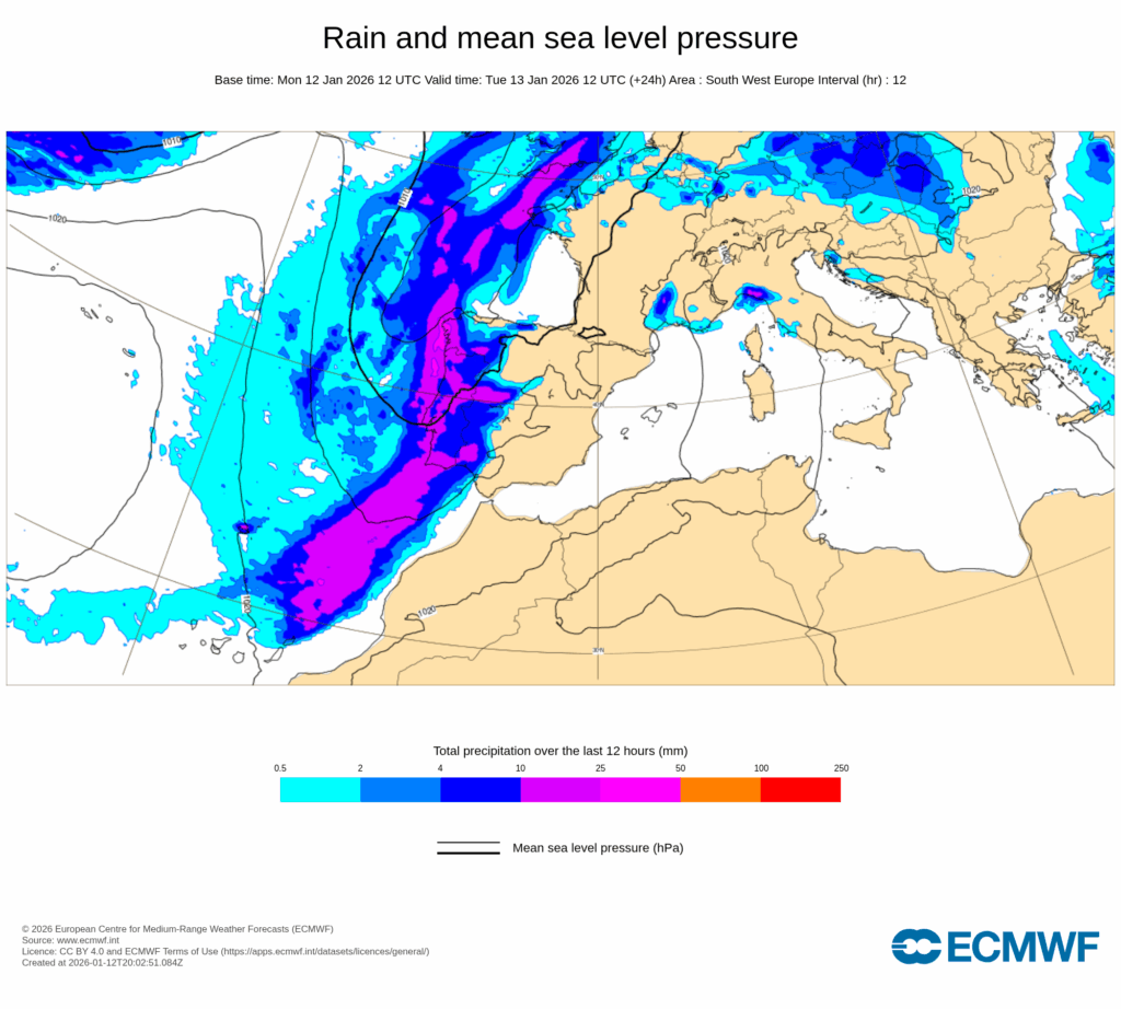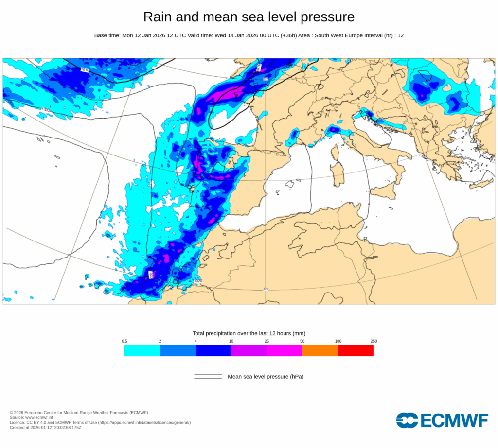 Durante el martes 13 de enero, el paso de frentes dejará un predominio de cielos nubosos o cubiertos con precipitaciones en la mitad oeste peninsular, y abundante nubosidad alta en la este y Baleares, también con intervalos de nubosidad baja matinal en el medio-bajo Ebro y puntos del Mediterráneo.