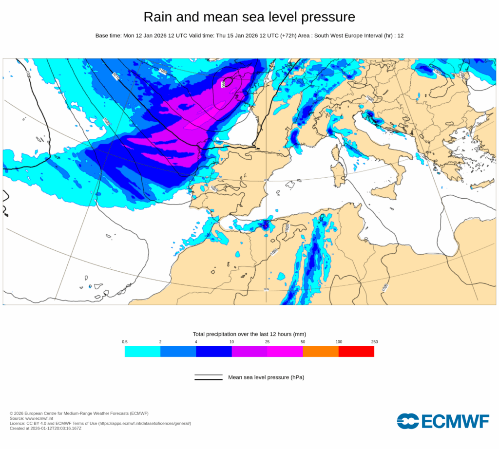 Las precipitaciones se esperan persistentes en el oeste de Galicia, de la Cordillera Cantábrica y del Sistema Central, mientras que es probable alcanzar intensidades fuertes, con tormenta y posible granizo ocasional, en Huelva y puntos de Cádiz.