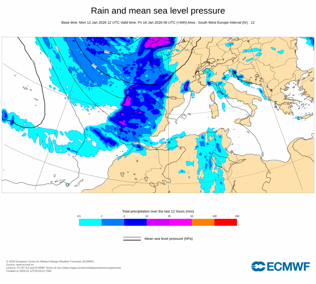 Serán menos probables en el Cantábrico, fachada oriental peninsular y Baleares, mientras que se prevén más abundantes en el oeste de Galicia y entorno del Estrecho, donde podrán ser persistentes y fuertes e ir con tormentas ocasionales.
